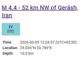 Gerash [Iran], March 3 (ANI): An earthquake of magnitude 4.3 hit Iran's southern part on Tuesday, as reported by Al Jazeera.