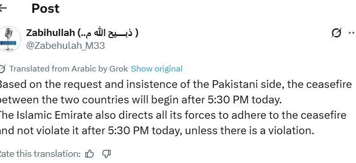 "At the request and insistence of the Pakistani side, a ceasefire between the two countries will be implemented after 5:30 PM today," Zabihullah Mujahid, the official spokesperson of the Islamic Emirate, wrote on X.
