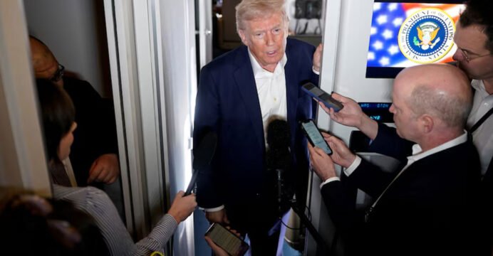US President Donald Trump speaks to reporters aboard Air Force One during a press gaggle. (File Photo/Reuters)