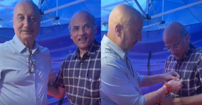 Taking to his Instagram handle, Anupam Kher shared a video of himself helping Barjatya with pinning an India badge on his shirt.