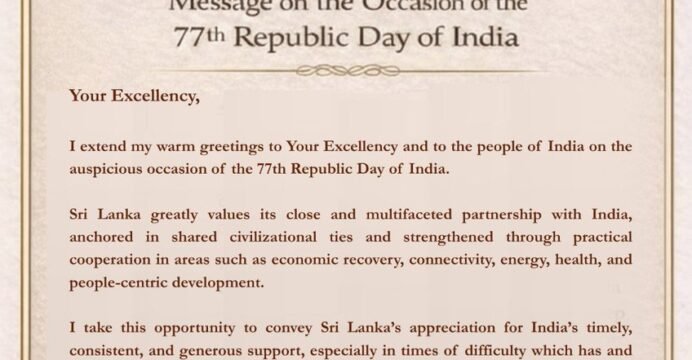 The Prime Minister of Sri Lanka, in an official message, said, " I extend my warm greetings to Your Excellency and to the people of India on the auspicious occasion of the 77th Republic Day of India."