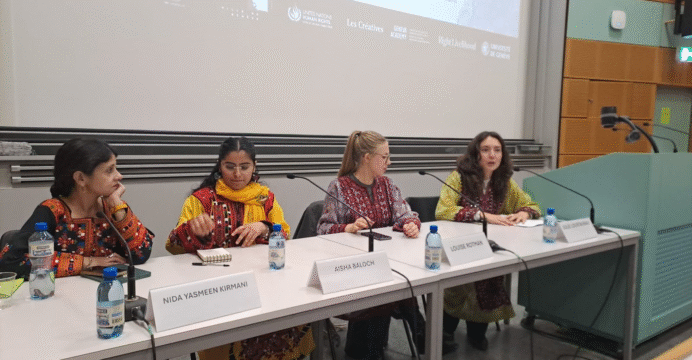 During the session about Balochistan, Karen Chappuis, a member of the 2025 Human Rights Week Organising Committee, facilitated the discussion. The session included presentations from Aisha Baloch, Associate Professor Nida Yasmeen Kirmani, Dr Sabiha Baloch of the Baloch Yakjehti Committee, and human rights activist Sammi Deen Baloch, followed by a panel discussion led by Louise Rotman and Julie Loustaunau from the University of Geneva.