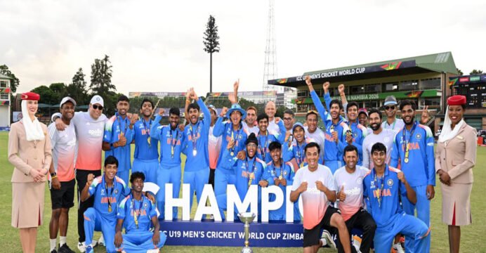India U19 defeated England U19 by 100 runs in the final to lift the ICC Under-19 World Cup 2026, securing their sixth title in Harare, Zimbabwe. The young Indian side produced a record-breaking performance in a high-octane final.