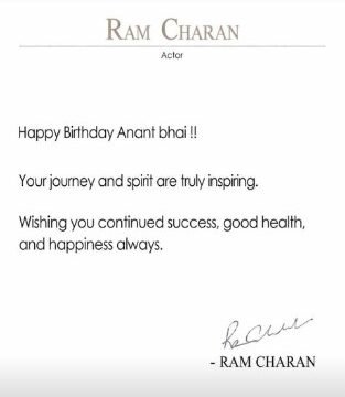 Actor Ram Charan also extended his wishes via Instagram Stories, acknowledging Ambani on his special day.