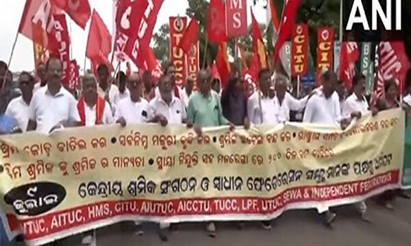 In Odisha's Bhubaneswar, the ten central trade unions were joined by the Biju Janata Dal (BJD)'s trade wing, "Biju Shramik Samukhya," protesting weakened workers' rights.