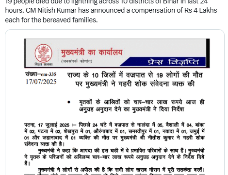 The Chief Minister Nitish Kumar has expressed deep condolences on the death of 05 persons in Nalanda, 04 in Vaishali, 02 in Banka, 02 in Patna, 01 in Sheikhpura, 01 in Aurangabad, 01 in Samastipur, 01 in Nawada, 01 in Jamui and 01 in Jehanabad due to lightning in the last 24 hours, as per the letter posted on X.