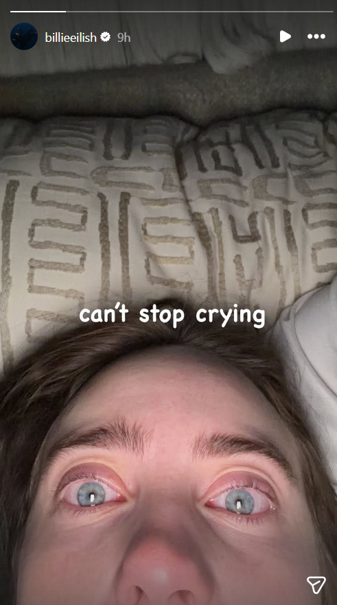 Billie Eilish also took to her Instagram handle and shared a zoomed-in, close-up selfie-style image of herself looking visibly emotional, with the center of the image featuring a text that reads, "can't stop crying."
