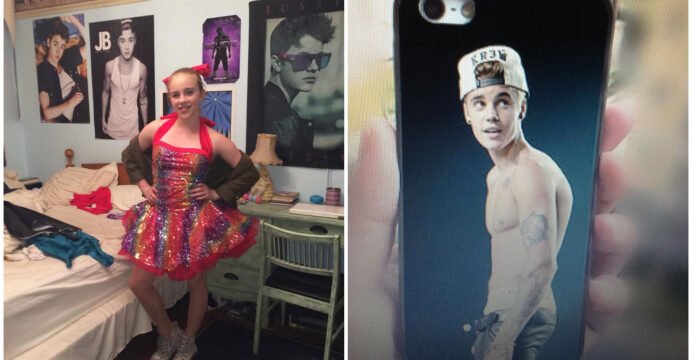 The carousel of images included a childhood photograph of Billie dressed in a rainbow sequin dance costume paired with white Converse shoes, standing in a bedroom covered with Justin Bieber posters. Another slide featured a whiteboard where she had rewritten lyrics from Aqua's 'Barbie Girl', adding fun references to Bieber's birthday, his Canadian roots, and her teenage obsession.