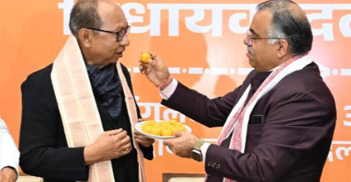 BJP National General Secretary Tarun Chugh congratulates newly-elected Manipur Legislature Party leader Yumnam Khemchand Singh