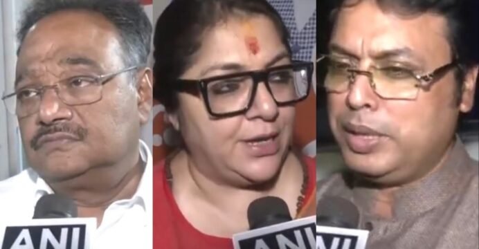 BJP leaders Samik Bhattacharya (left), Locket Chatterjee (centre), Biplab Kumar Deb (right) (Photo/ANI)