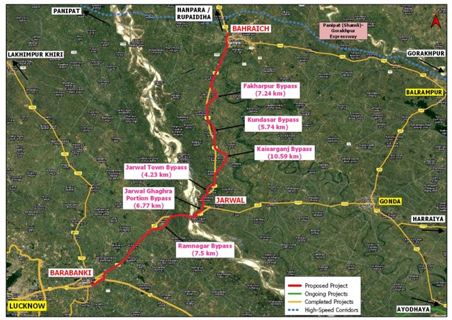 The highway includes 48.28 km of bypass and links major national highways, including NH-27, NH-330N, NH-730, as well as state highways SH-13 and SH-30B. It enhances connectivity to key economic, social, transport nodes such as Lucknow and Shravasti airports, multiple railway stations including Barabanki, Rasauli, Jangirabad, and Bahraich, and the Rupaidiha land port.