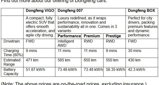 The latest Dongfeng VIGO, Dongfeng 007 and Dongfeng BOX will be sold at all Dongfeng showrooms powered by Carro in Singapore and Malaysia. All Dongfeng cars by Carro come with an Authorised Dealer warranty, as well as Carro's exclusive financing and insurance solutions.
