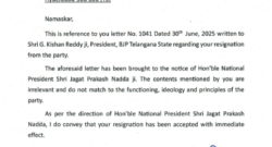 Jul 11, 2025New Delhi , July 11 (ANI): BJP National President JP Nadda, on Friday accepted the resignation of Telangana MLA T Raja Singh from the party with immediate effect.According to a letter by Arun Singh, the BJP's...