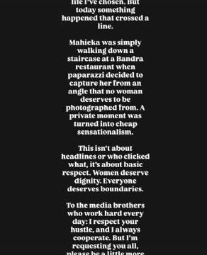 While describing the incident as a "cheap sensationalism", Hardik wrote, "I understand that living in the public eye comes with attention and scrutiny; it's part of the life I've chosen. But today, something happened that crossed a line. Mahieka was simply walking down a staircase at a Bandra restaurant when paparazzi decided to capture her from an angle that no woman deserves to be photographed from. A private moment was turned into cheap sensationalism."