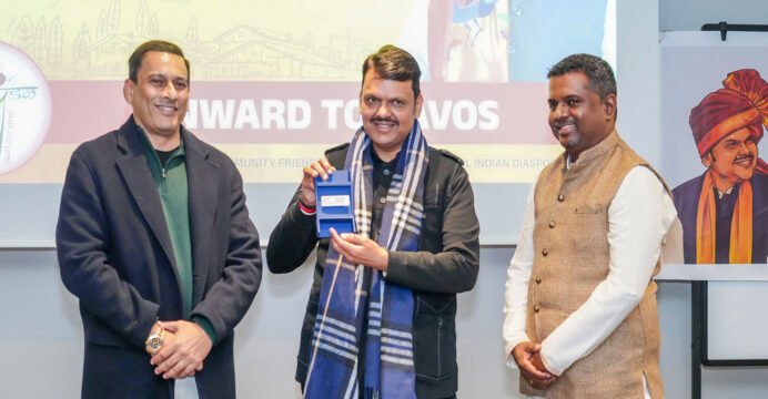 Davos: CM Fadnavis accepts World Economic Forum badge representing ‘Magnetic Maharashtra’; praises diaspora for cultural connect