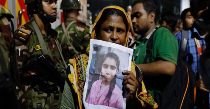 A relative mourns while holding a picture of a missing girl following a fire that broke out at a garment factory and a chemical warehouse in Dhaka (Photo/Reuters)