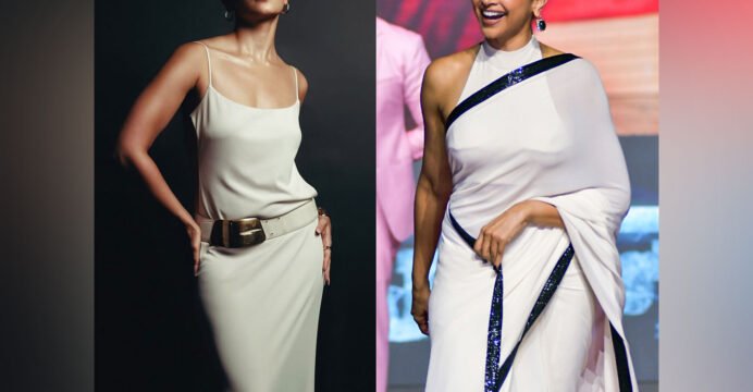 Coming back to the event, Alia Bhatt chose a strappy long white dress with a satin finish. She completed the look with a statement belt, light jewellery, and a white hand-held bag. Alia kept her hair tied in a bun, further accentuated with smoky eyes and nude lips.