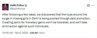 "After following a few leads, we discovered that the hype around the surge in missing girls in Delhi is being pushed through paid promotion. Creating panic for monetary gains won't be tolerated, and we'll take strict action against such individuals," the Delhi Police wrote in a post on X.