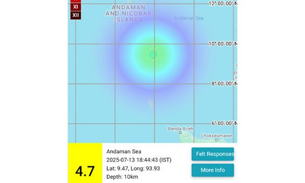 In a post on X, the NCS said, "EQ of M: 4.7, On: 13/07/2025 18:44:43 IST, Lat: 9.47 N, Long: 93.93 E, Depth: 10 Km, Location: Andaman Sea."