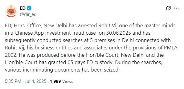 ED arrests mastermind in Chinese App investment fraud case; raids conducted in Delhi