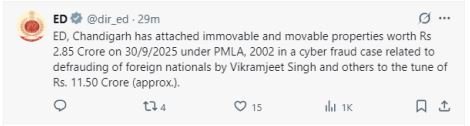 ED's Chandigarh zonal office attached the properties on September 30 under the provisions of the Prevention of Money Laundering Act (PMLA), 2002, in the case related to defrauding of foreign nationals by Vikramjeet Singh and others to the tune of Rs 11.50 crore.