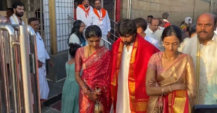 Earlier in the day, Telugu actress Krithi Shetty was also spotted at the temple along with director Venkky Kudumula for darshan. The actress was seen smiling and waving at the cameras before entering the temple premises.