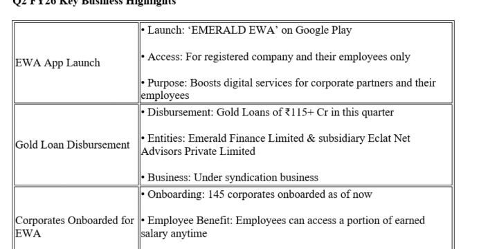 Comment on Financial Performance Mr. Sanjay Aggarwal, Managing Director of Emerald FinanceLimited said, "Q2 FY26 has been another strong quarter for Emerald Finance, reflecting sustained growth momentum across our key business segments. We have onboarded 145 corporates on our Earned Wage Access platform till date and successfully launched the 'Emerald EWA' mobile app on Google Play, further enhancing digital accessibility for our corporate partners and their employees. Our gold loan syndication business continued to gain strong traction, achieving disbursements of ₹115 + crore during Q2 FY26. This reflects the growing confidence of our partners and the scalability of our asset-light, technology-driven model.