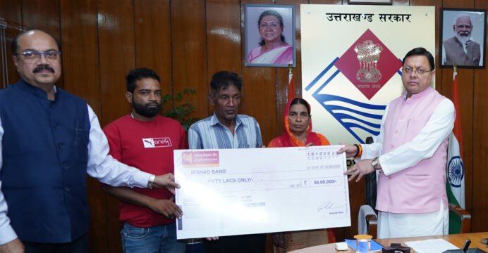 Following deaths of three personnel in separate road accidents, CM Dhami hands over cheques of Rs 50 lakh each to their dependents