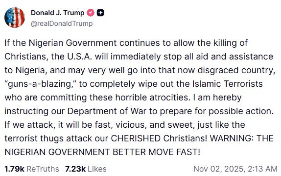 He added, "I am hereby instructing our Department of War to prepare for possible action. If we attack, it will be fast, vicious, and sweet, just like the terrorist thugs attack our cherished Christians! WARNING: THE NIGERIAN GOVERNMENT BETTER MOVE FAST!"
