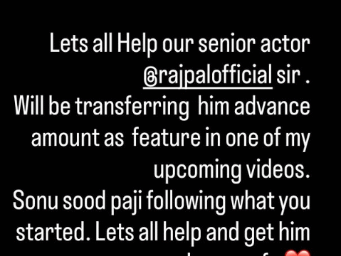 Sonu Sood wrote, "Rajpal Yadav is a gifted actor who has given years of unforgettable work to our industry. Sometimes life turns unfair, not because of talent, but because timing can be brutal. He will be part of my film, and I believe this is the moment for all of us producers, directors, colleagues to stand together."