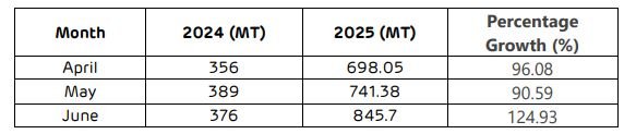 The previous monthly highest was 754 tonne in January this year.