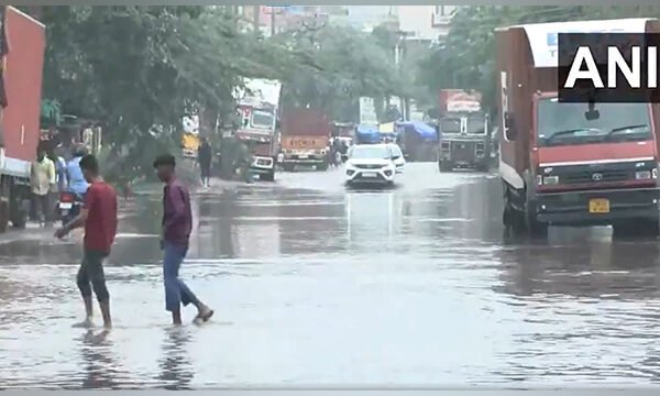 Gurugram (Haryana) [India], July 10 (ANI): Following incessant overnight rainfall, several parts of Gurugram are facing severe issues of waterlogging. Latest visuals from Narsinghpur area of Gurugram showed waterlogged roads, causing the traffic to slowdown in the area and creating problems for the pedestrians.