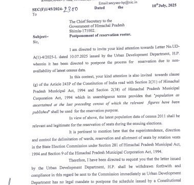 Earlier in the day, the Himachal Pradesh Government had directed a postponement of the reservation process for ULBs due to the absence of updated demographic data from the delayed national Census.