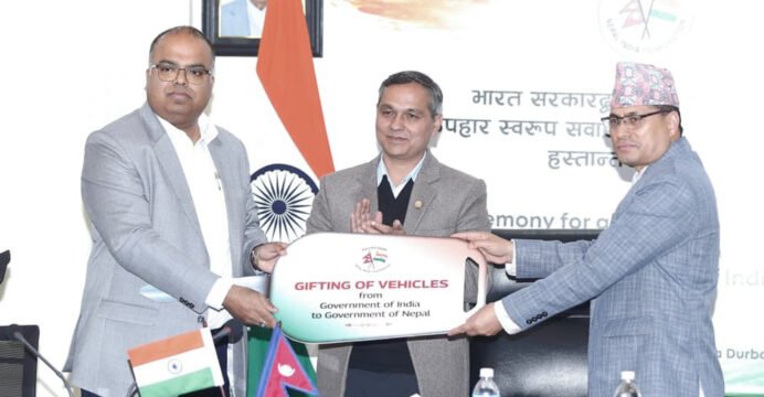 Charge d'Affaires of the Embassy of India in Kathmandu, Rakesh Pandey, handed over the trance which consisted of more than 60 double-cab pickup vehicles along with other supplies.