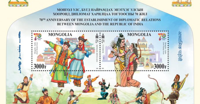 The special stamp features Ramlila, a traditional Indian folk theatre form that depicts the life of Lord Rama, and Biyelgee, a distinctive Mongolian folk dance that reflects nomadic life and is performed in a seated or kneeling posture.