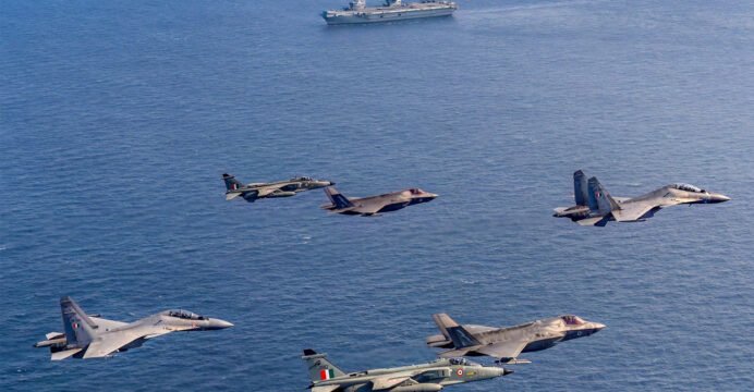 The exercise involved a range of frontline platforms, including the Indian Air Force's Sukhoi-30 MKIs, Jaguar fighter aircraft, Airborne Warning and Control System (AWACS), and Airborne Early Warning and Control (AEW&C) aircraft. From the Royal Navy, F-35B fighter jets operating from HMS Prince of Wales participated in the coordinated mission.