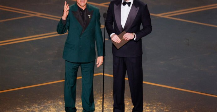 The duo presented the adapted screenplay award to filmmaker Paul Thomas Anderson for the film One Battle After Another. Later, while announcing the original screenplay nominees, Downey Jr. jokingly handed Evans sparkly underwear worn by Channing Tatum in the film Magic Mike. From the audience, Tatum shouted that he would need the underwear "for work later".