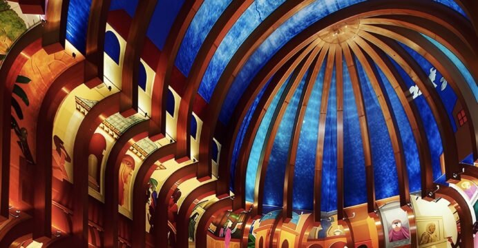 The painting is done onto the curved surface of the lobby dome with spectacular visual angles, bringing together a fusion of Mauryan past and present, still fresh and rich in cultural context.