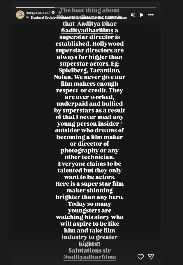 In a note shared on Instagram, Kangana described Dhar as a "superstar filmmaker" and said his journey would inspire a new generation of filmmakers.