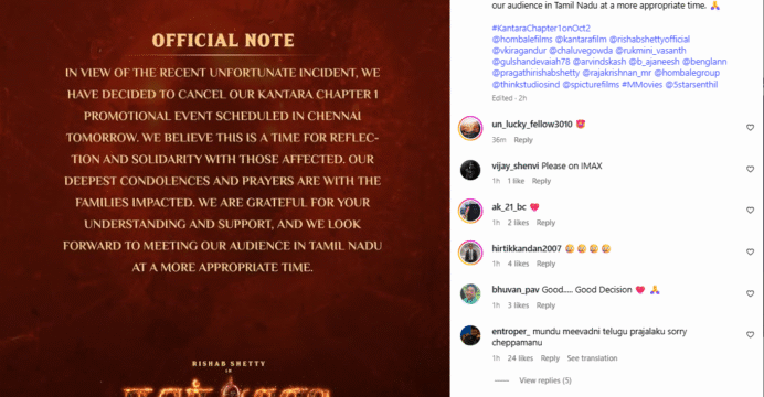"In view of the recent unfortunate incident, we have decided to cancel our Kantara Chapter 1 promotional event scheduled in Chennai tomorrow. We believe this is a time for reflection and solidarity with those affected. our deepest condolences and prayers are with the families impacted. We are grateful for your understanding and support, and we look forward to meeting our audience in Tamil Nadu at a more appropriate time," the statement read.