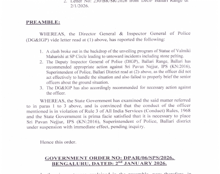 Karnataka [India], January 2 (ANI): The Karnataka government on Friday suspended Pavan Nejjur, IPS, Superintendent of Police, Ballari district, following a clash that broke out in the unveiling program of the Statue of Valmiki Maharishi at SP Circle.