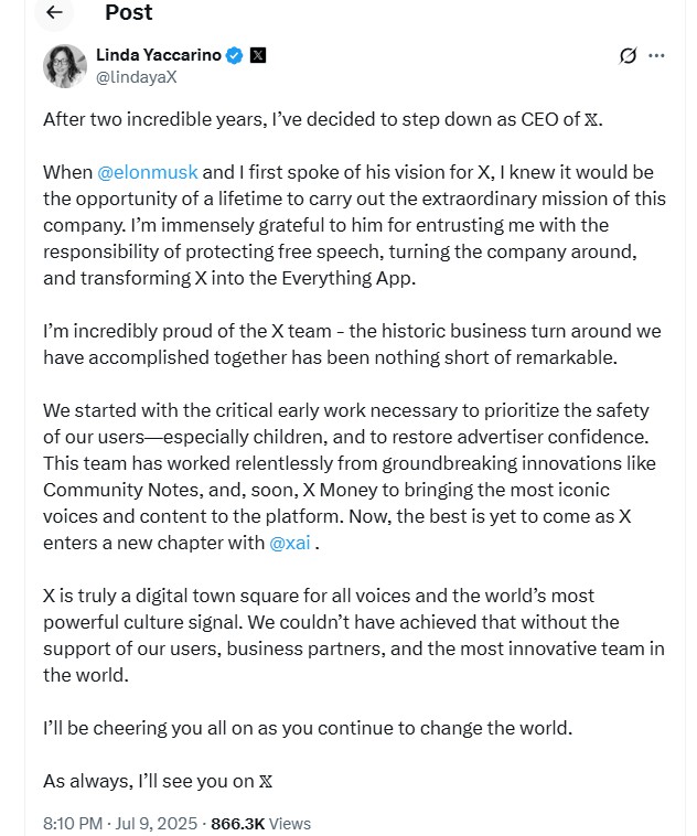 "After two incredible years, I've decided to step down as CEO of X. When Elon Musk and I first spoke of his vision for X, I knew it would be the opportunity of a lifetime to carry out the extraordinary mission of this company," she posted on the platform.