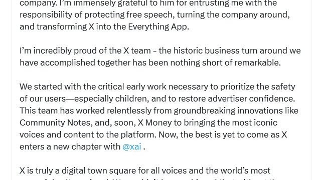 "I'm immensely grateful to him for entrusting me with the responsibility of protecting free speech, turning the company around, and transforming X into the Everything App. X is truly a digital town square for all voices and the world's most powerful culture signal. We couldn't have achieved that without the support of our users, business partners, and the most innovative team in the world," she added.