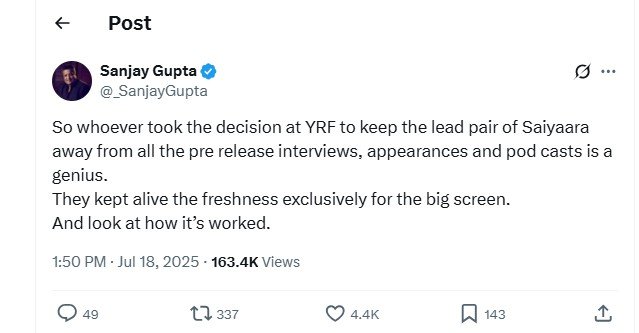 "Whoever took the decision at YRF to keep the lead pair of Saiyaara away from all the pre-release interviews, appearances, and podcasts is a genius," Gupta wrote.