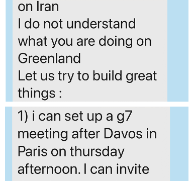 The message by Macron in full read: "My friend, We are totally in line on Syria. We can do great things on Iran. I do not understand what you are doing on Greenland. Let us try to build great things: 1) i can set up a g7 meeting after Davos in Paris on thursday afternoon. I can invite the ukrainians, the danish, the syrians and the russians in the margins 2) let us have a dinner together in Paris together on thursday before you go back to the us. Emmanuel."