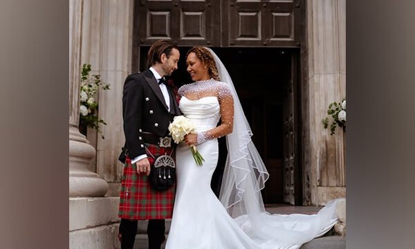 She wore a gown from the London-based shop Evelie Bridal, which featured a strapless corset and a sheer illusion jacket embellished with pearls. She paired the dress with a cathedral veil and wore her hair up, with natural curls framing her face, as reported by People.