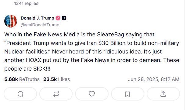 In a post on Truth Social, Trump wrote, "Who in the Fake News Media is the SleazeBag saying that "President Trump wants to give Iran $30 Billion to build non-military Nuclear facilities." Never heard of this ridiculous idea. It's just another HOAX put out by the Fake News in order to demean. These people are SICK!!!"