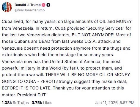 In a post on Truth Social, Trump wrote, "Cuba lived, for many years, on large amounts of OIL and MONEY from Venezuela. In return, Cuba provided "Security Services" for the last two Venezuelan dictators, BUT NOT ANYMORE! Most of those Cubans are DEAD from last weeks U.S.A. attack, and Venezuela doesn't need protection anymore from the thugs and extortionists who held them hostage for so many years. Venezuela now has the United States of America, the most powerful military in the World (by far!), to protect them, and protect them we will. THERE WILL BE NO MORE OIL OR MONEY GOING TO CUBA - ZERO! I strongly suggest they make a deal, BEFORE IT IS TOO LATE. Thank you for your attention to this matter. President DJT."