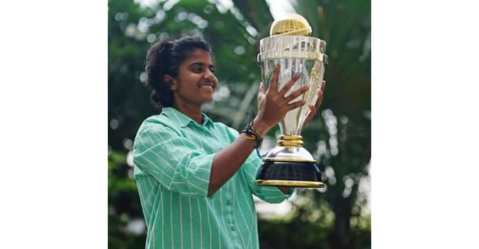 Shree Charani with Women's ODI World Cup trophy. (Photo/Instagram@Shreecharani)
