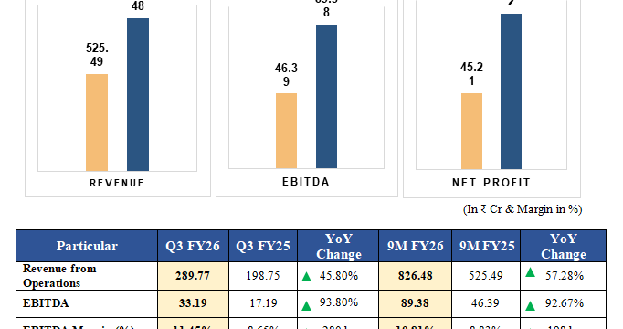 Revenue from Operations for 9M FY26 stood at ₹826.48 Cr, registering a robust growth of 57.28% YoY. EBITDA increased by 92.67% to ₹89.38 Cr, with EBITDA margins improving by 198 bps to 10.81%, demonstrating operating leverage and better cost management. Net Profit rose by 104.20% YoY to ₹92.32 Cr, while Net Profit Margin improved by 202 bps to 10.37%. EPS (Diluted) nearly doubled to ₹3.15, up 98.11% YoY.